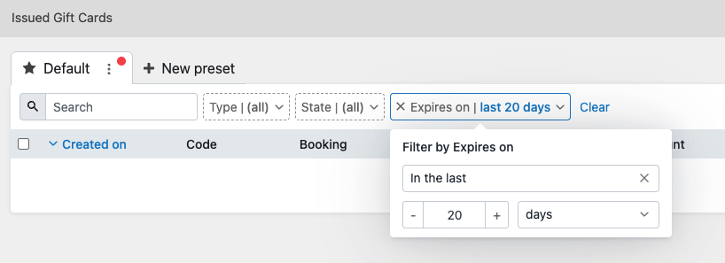 Issued Gift Cards list has a new “expires on“ filter that allows narrowing down results to already expired, or not yet expired gift cards (by setting the expiry date in the future).