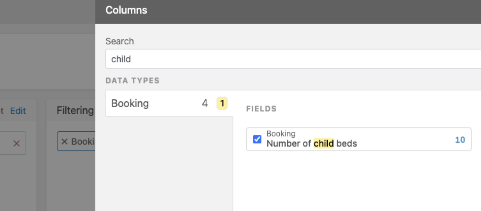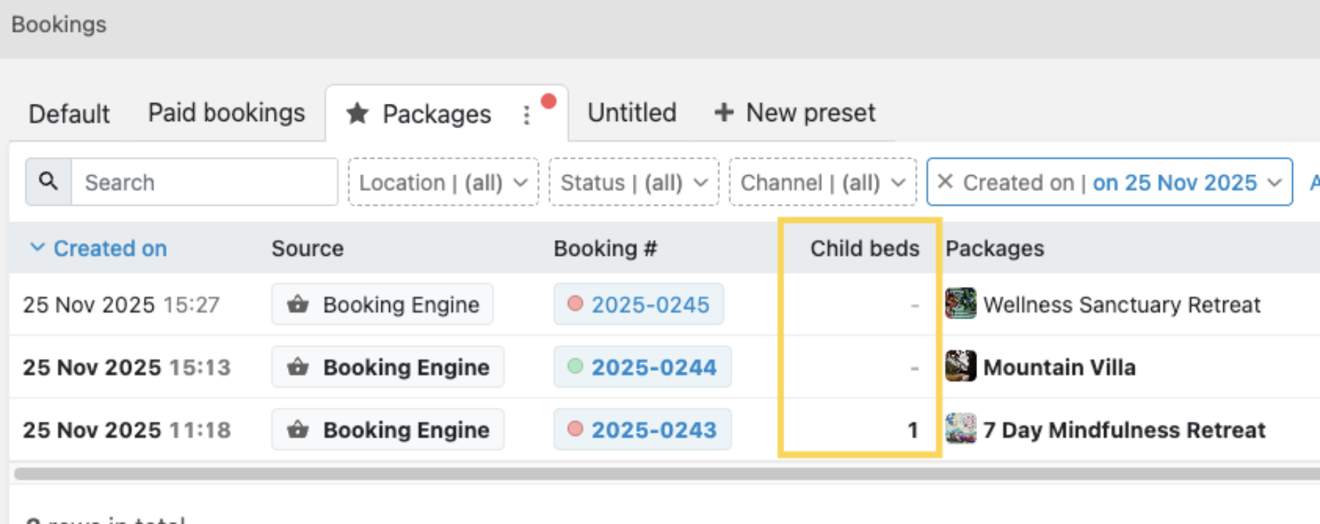 Now the number of booked child beds within a booking can be tracked in the bookings list by adding a new child beds column, and in the new custom reports (data type: booking -> field: number of child beds).