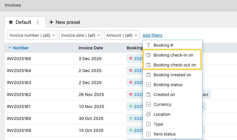 Invoices list has two additional filters for “check-in and check-out on“ dates, which allow filtering invoices for bookings based on the their check-in/out dates.