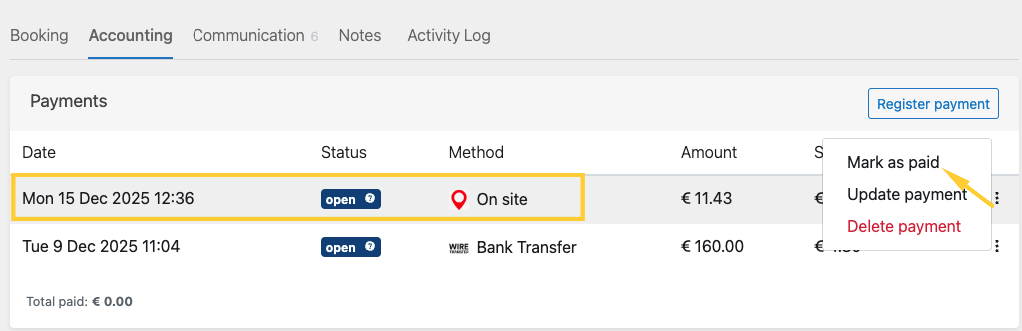 When the on-site payment is selected, it will appear as an “open“ payment in the Accounting tab of the booking. Once the guest arrives at the location (for example upon check-in) and pays on-site, the Backoffice user can manually select “mark it as paid“. At that moment, the payment will change to “ok” status.