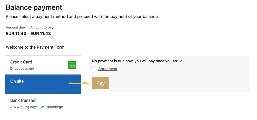 If your business accepts on-site payments, this flow can now be tracked more easily. The flow is very similar to the bank transfer flow. Once the booker selects “on-site payment“ method in the Payment Form, he can register that selection by clicking on “Pay“ button.